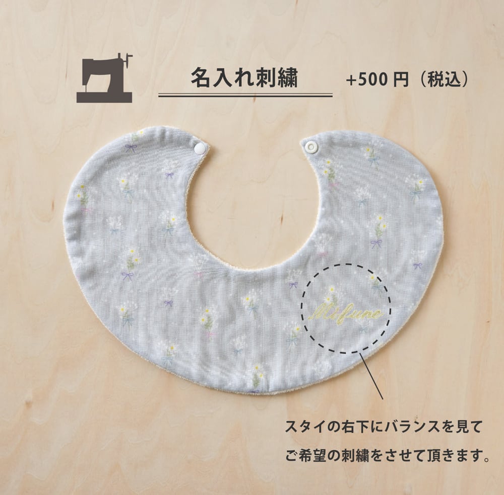 スタイには刺繍をお入れして、世界に1つのご出産祝いに最適です(有料オプション)