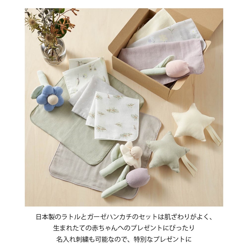 やわらかラトルとガーゼ3枚セット 出産祝い ギフト ベビー 赤ちゃん 男の子 女の子 おしゃれ ガーゼハンカチ ラトル お花 くすみカラー ガラガラ おはな にぎにぎ がらがら ニギニギ 新生児 0歳 1歳 生後半年 インスタ映え 写真 プレゼント