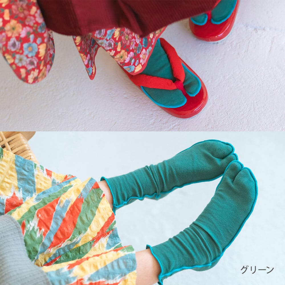 キッズ用のおしゃれな足袋ソックスが登場! かかとのないストレートタイプなので 3 歳~ 7 歳頃まで幅広いサイズで着用いただけます。