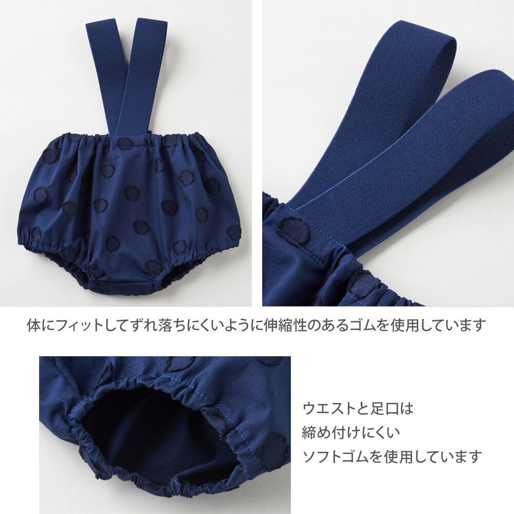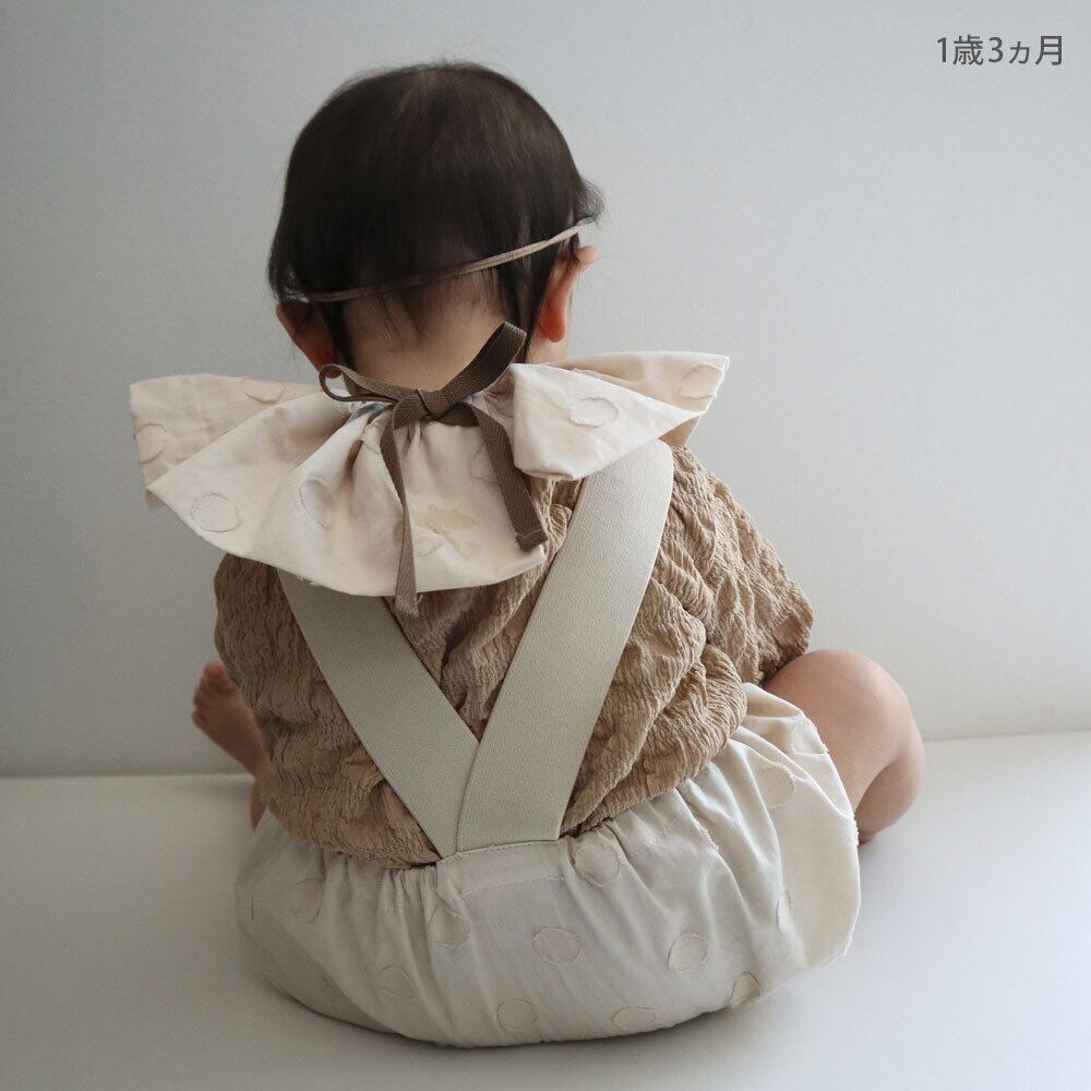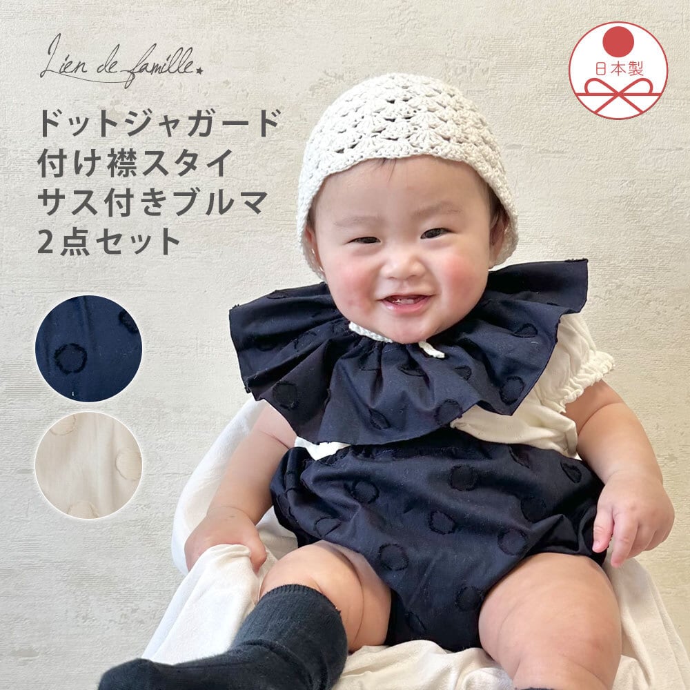 \1歳 前後 の プレゼント におすすめ/ 前後着用可 ドットジャガード 付け襟スタイ と サス付きブルマ2点セット 赤ちゃん 誕生日 ハーフバースデー 100日祝い 撮影 付け襟スタイ ベビー ブルマ パンツ セット 日本製 女の子 男の子 付け襟 サス付き おしゃれ ベージュ ネイビー 6ヵ月 1歳 70cm 80cm ギフト 出産祝い 綿 100% Lien de famille リヤンドファミーユ