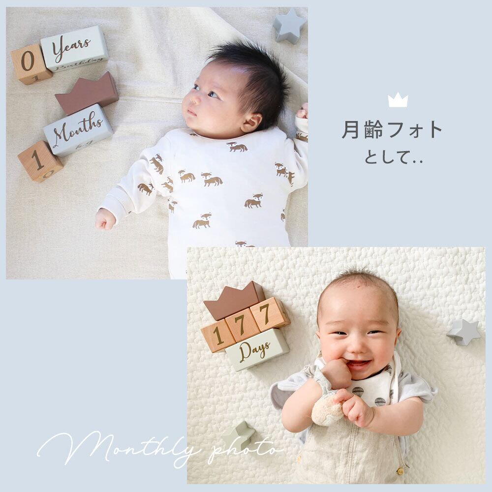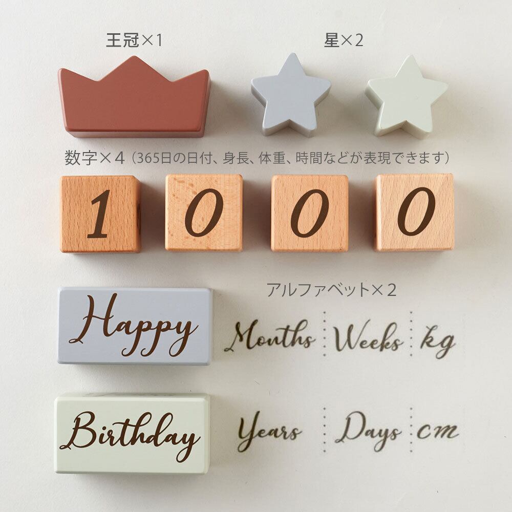 積み木は365日の日付、身長、体重、時間などが表現できる、4桁の数字と英語と、それを彩る星と王冠のセットです。