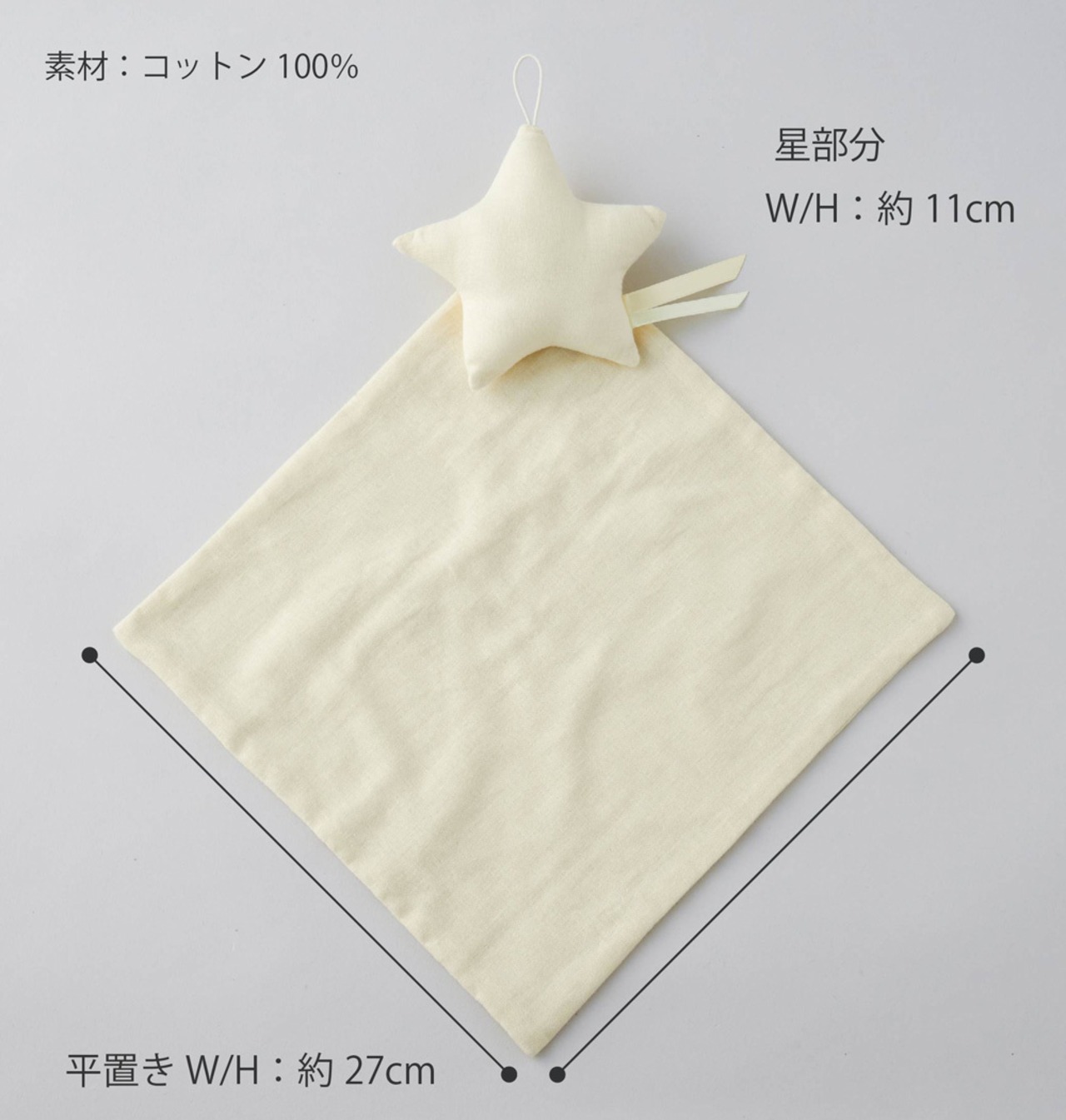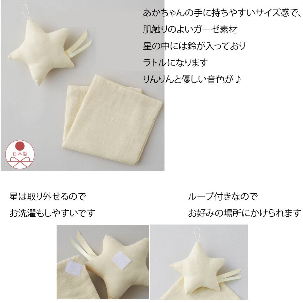 ラトル付きガーゼハンカチは日本製の綿100%なので、赤ちゃんのお口ふきや日常使いにぴったりです。