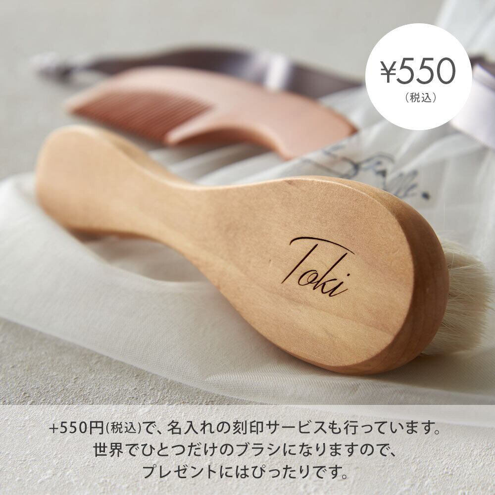 オプションでブラシは名入れ彫刻(550円)、ハンカチは名入れ刺繍(格550円)が可能なので、特別な贈り物におすすめです。
