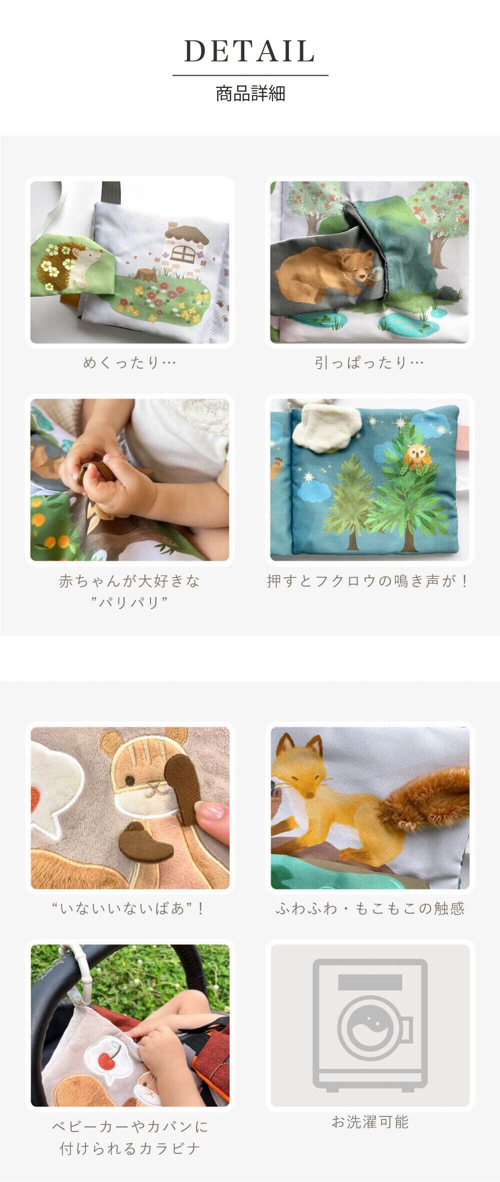カシャカシャ・パリパリと赤ちゃんが大好きな仕掛けがいっぱい。赤ちゃんが大好きなタグも付いています。カラコロ、音を楽しんだり、めくったりと色んなしかけで