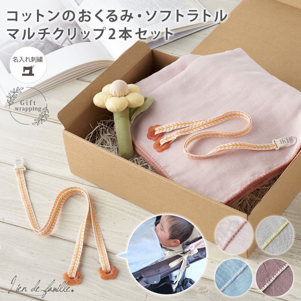\お出かけが楽しくなる♪/コットンのおくるみ・ソフトラトル・マルチクリップ2本セット お花のラトル きょうりゅう ママもつかえる 出産祝い の メッセージ シンプル おしゃれ 出産祝い 名入れ ギフト 日本製 おくるみ ラトル マルチクリップ ベビー 女の子 男の子 ブランケット 退院 春 夏用 綿100% ガラガラ 赤ちゃん 1万円 新生児 3ヶ月 ギフトセット プレゼント 全4色 Lien de famille リヤンドファミーユ